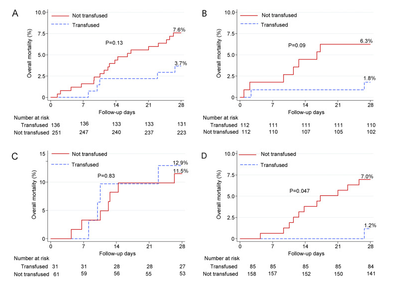 相对于未输血的患者来说,输血的患者一般都比较年轻,主要是男性,BMI较高,并发症发生率较低(特别是慢性肺病、慢性肾病、高脂血症、冠心病和高血压,但不是糖尿病),更有可能需要吸氧,炎症标志物浓度较高。使用类固醇、阿奇霉素和托珠单抗在输血队列中更为常见,但使用瑞德西韦则不然。