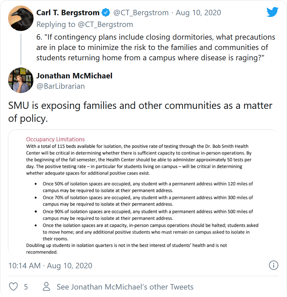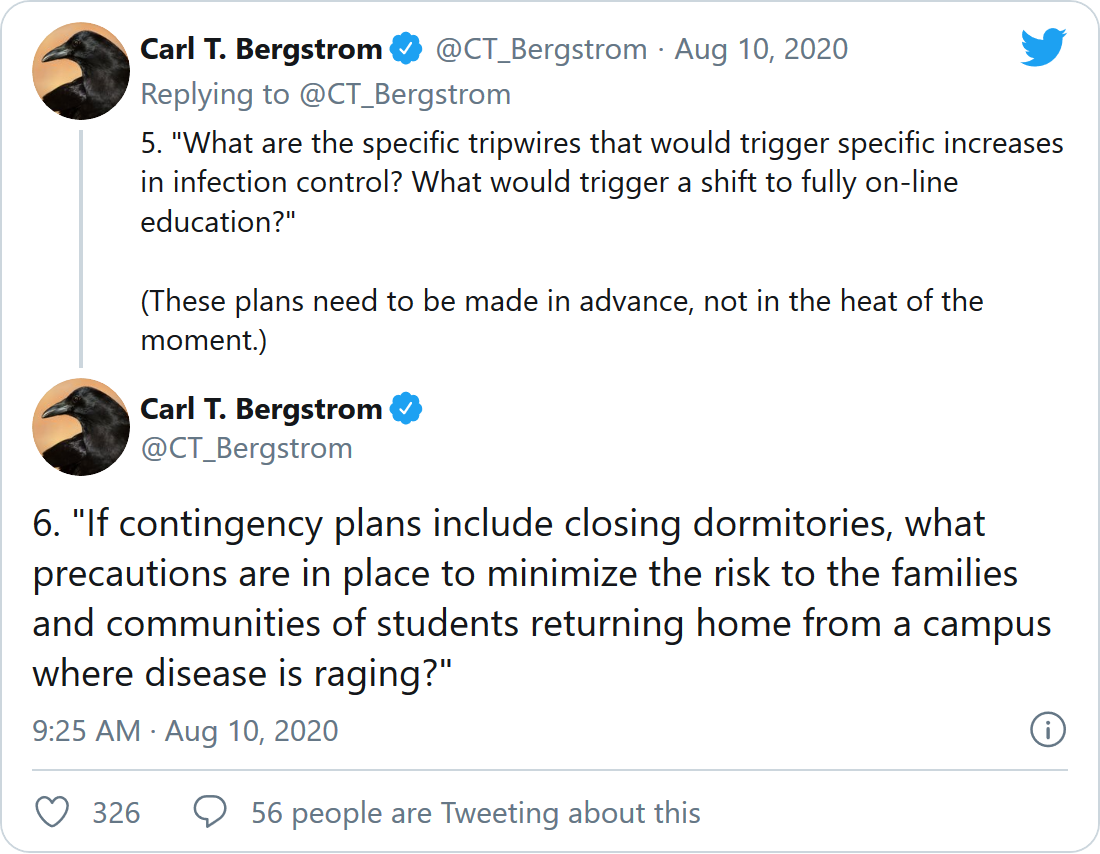 若不接受检测就直接把学生送回家有可能让他们把病毒带回家并在他们的家乡重新传播。华盛顿大学的生物学教授Carl Bergstrom在Twitter上发文称:“随着学校上网,他们将把疾病传播回给社区比例更大的弱势人群。”Berstrom曾在本月初指出,如果宿舍关闭学生将不得不被送回家中,学院和大学应该制定如何保护学生家庭的计划。