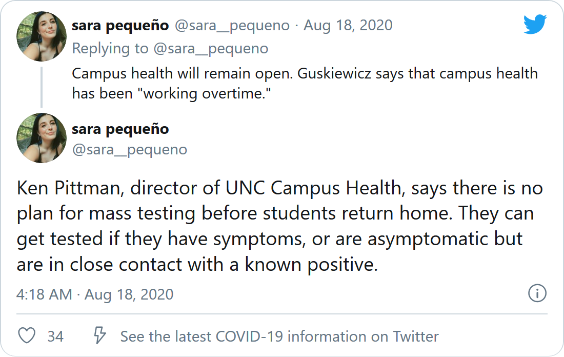 负责学生事务的副校长Jonathan Sauls在教职工执行委员会会议上表示,学校正在鼓励学生自愿离校并希望每间校园宿舍只安排一人居住。但据在会议上发言的校园卫生主任说,他们不打算在所有学生回家之前对他们进行测试。有症状的学生或跟确诊病例有过接触的学生可在校园卫生服务中心接受检测。