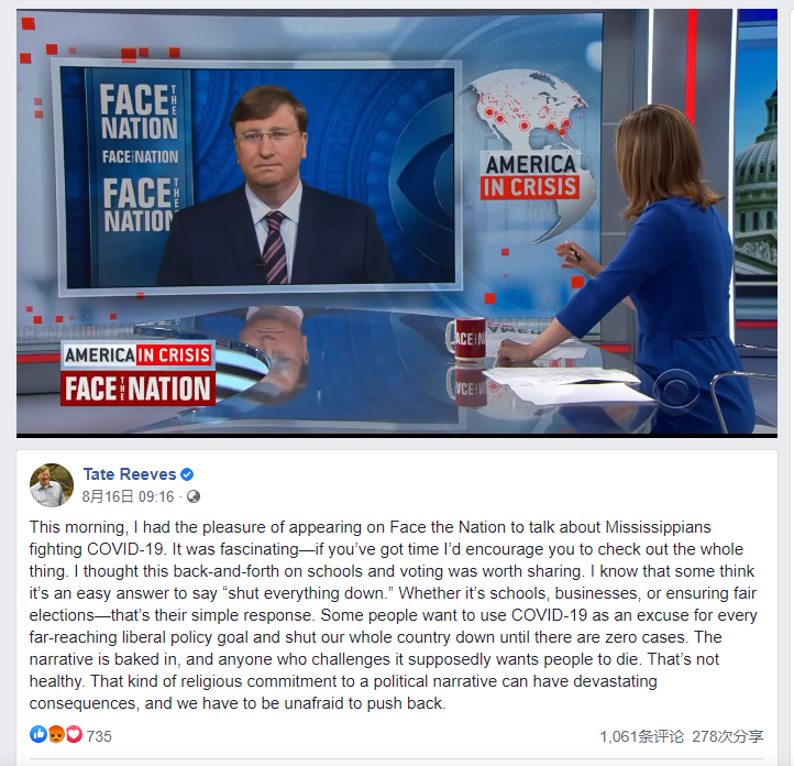 周日,Reeves出现在CBS的《Face the Nation》节目中,讨论了他重新开放学校的决定,并在不久后在Facebook上为密西西比州的计划辩护: