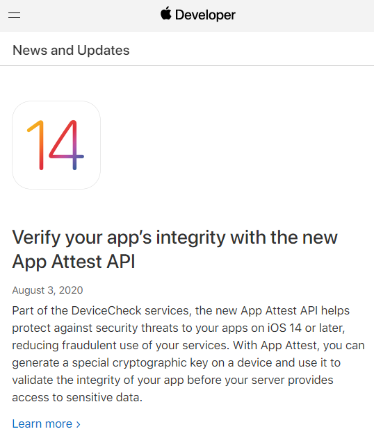 为增强移动平台上的应用程序安全性,苹果已经为 iOS 14 引入了一项被称作“Device Attest”的设备检查新功能。据悉,苹果在 iOS 11 上开始引入 DeviceCheck 框架,以减少欺诈性应用的开发和使用。在 iOS 14 中,苹果进一步向该框架中注入了一个名为“App Attest”的新 API 。与 DeviceCheck 一样,App Attest 旨在减少针对其开发服务的不当使用。