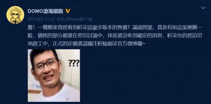 《轩辕剑7》制作人杨渊升在微博中称:惊!一觉醒来竟然看到轩柒这么多版本的售价?满头问号,真是有如这张梗图一般,价格的部分都还在密切讨论中,我是还没收到确定的消息,轩柒也仍然迫切地赶工中,正式的定价还请关注轩辕剑柒官方微博啰~