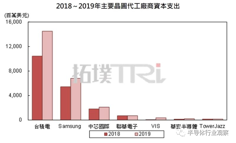 台积电对于追求先进制程的激进表现一直延续至今,同样想要追赶先进制程的对手们也遵循了这种做法。数据显示,在2019年全球经济不稳定造成的晶圆代工产业衰退下,晶圆代工厂商在资本支出方面仍然没有减少。