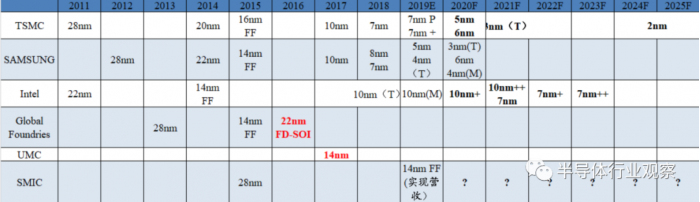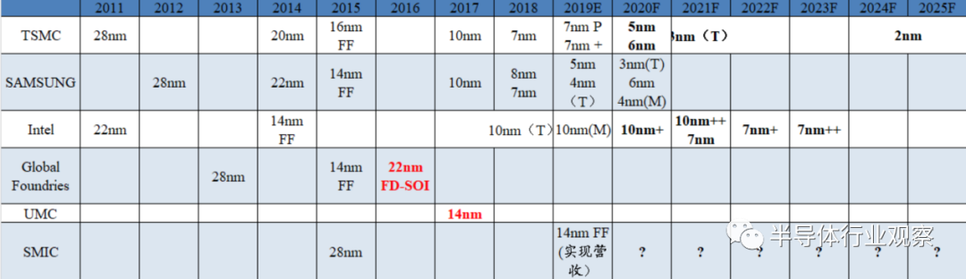 这些年来,随着行业资金不断扩大,技术壁垒持续增高,不仅十多年来没出现新的竞争玩家,而且随着制程分水岭的出现,越来越多的参与者从先进制程中“出局”。格芯在2018年宣布放弃7nm研发,联电在2018年宣布放弃12nm以下(即7nm及以下)的先进制程投资,因此保持先进制程研发的玩家仅剩行业龙头台积电、三星、英特尔等,以及处于技术追赶的中芯国际。