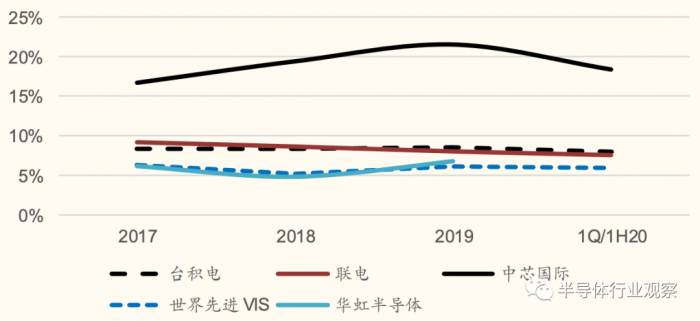 值得注意的是,中芯国际从2017年的16.72%,增加到2019年的21.55%,其研发费用占营收比超过两倍于台积电/联电的8-9%及世界先进/华虹的6-7%。这足以看出他们对未来的野望。