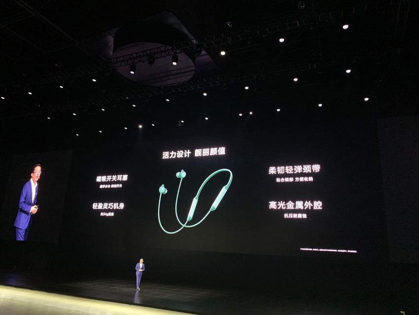 第二款产品是颈带耳机,它具备磁吸开关耳塞,轻盈的灵巧机身,颈带部分非常柔韧,并改用高光金属外腔。