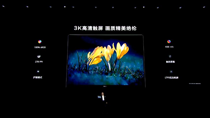 该机装备了 3K 高清触控屏幕,亮度为 400 nits,触控屏幕,支持 LTPS低功耗屏幕,具备护眼模式,像素密度为 278 ppi,100% sRGB。