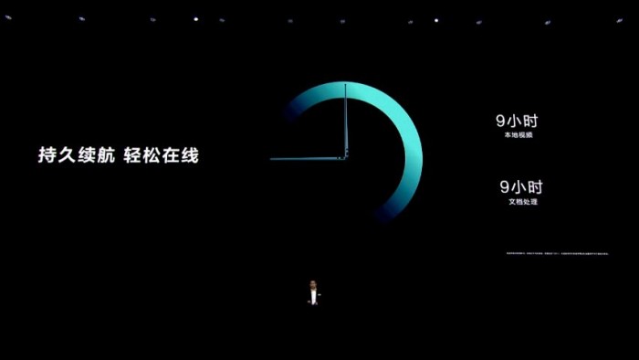 Matebook X 装备了 65W 的快充,适配器重量仅重94g,本地视频续航时间为9小时,文档处理时间为 9小时。