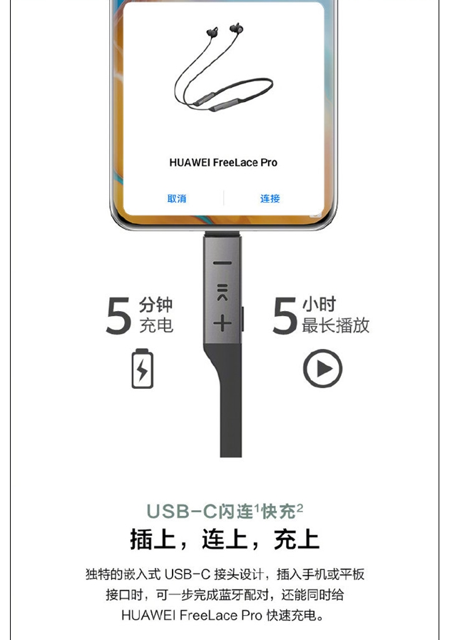 该耳机支持独特的USB-C闪连快充技术,让你随时随地可以用手机、平板、电脑给耳机充电,充电5分钟听歌5小时,满电最长连续播放音乐24小时。