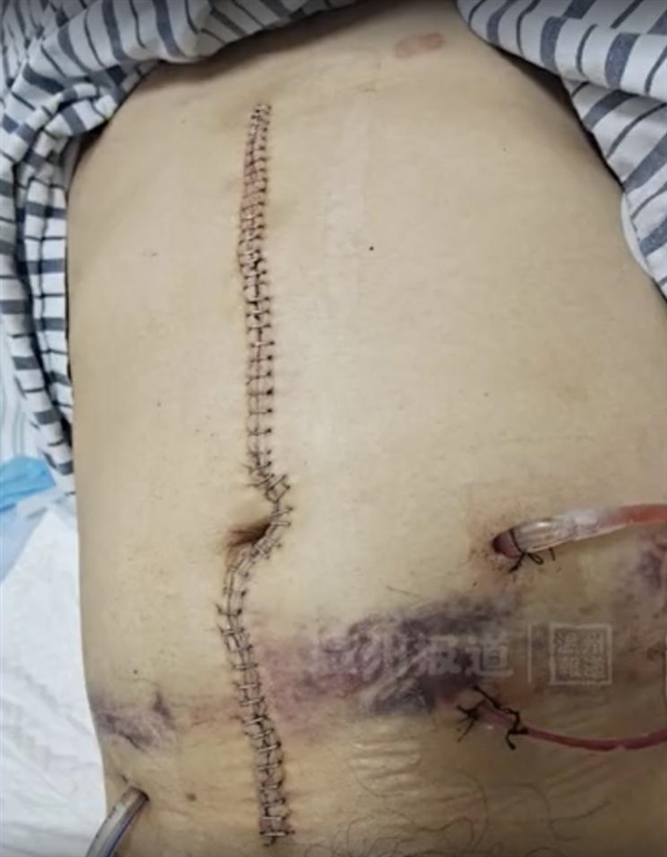 驾驶员陈先生也受伤严重,经过了7个多小时抢救,腹部的手术创口超20cm,输血近5000毫升,才抢救成功,保住了性命。(以下画面易引起不适,谨慎观看)