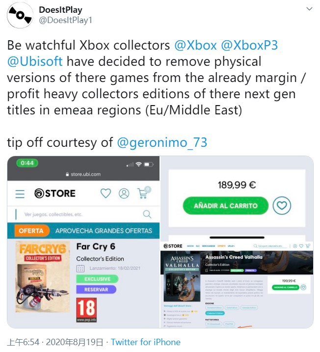 据国外网友@DoesItPlay爆料,育碧已经决定移除自家游戏Xbox平台的实体典藏版,而且将仅会在相对奖励丰厚的EMEAA地区(欧洲/中东)进行试运行。网友@DoesItPlay爆料称,购买Xbox典藏版游戏的玩家们注意了,育碧已决定从EMEAA地区(欧洲/中东)移除奖励丰厚的Xbox平台(本世代和次世代)实体典藏版游戏。