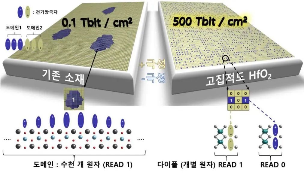 图1:比较当前(左)和新(右)FeRAM的示意图Lee教授及其研究小组发现,通过向称为铁电氧化Ha(HfO2)的半导体材料中添加一滴电荷,可以控制四个单独的原子来存储1位数据。
