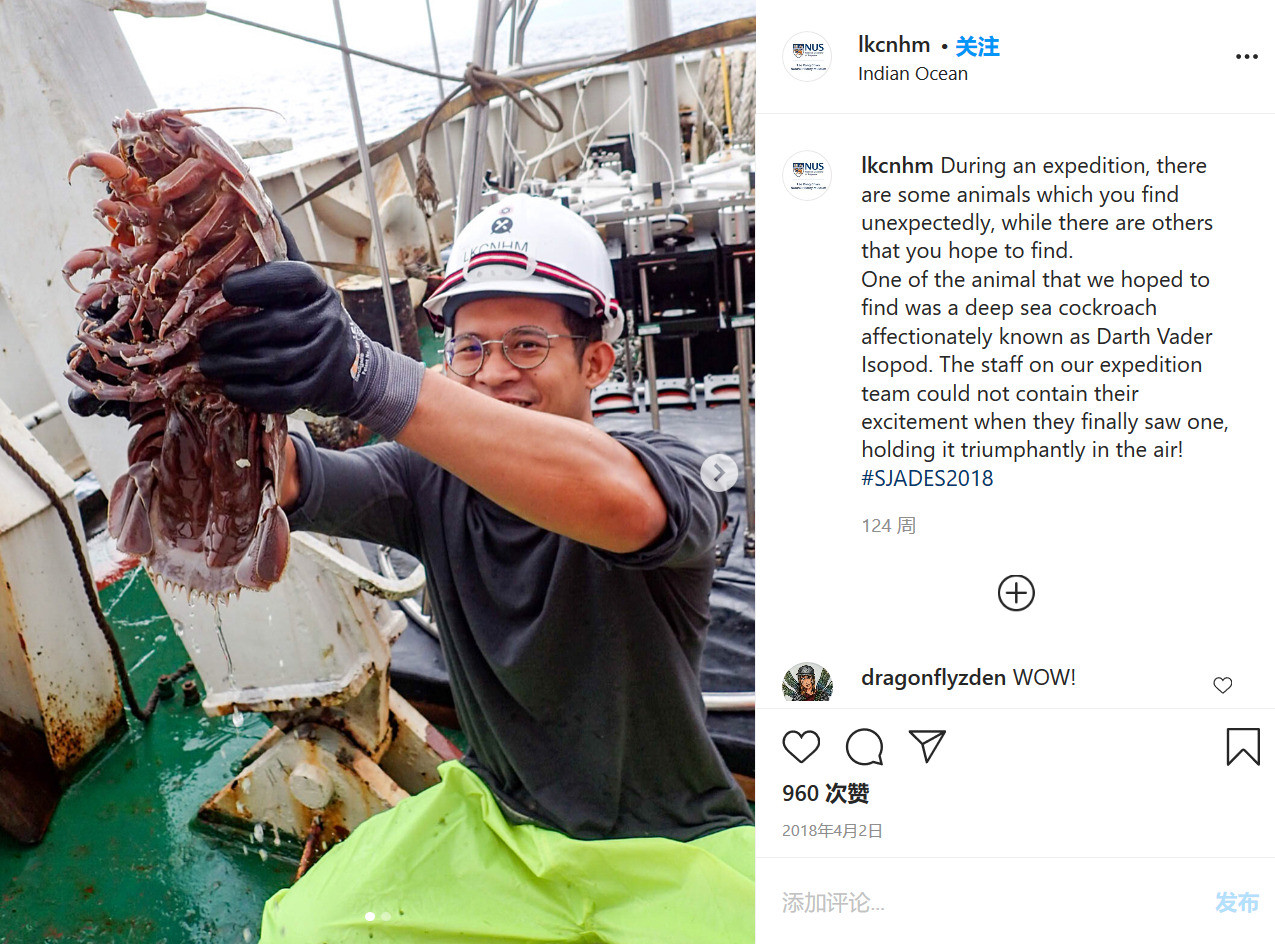 李光前自然历史博物馆(Lee Kong Chian Natural History Museum)在Instagram上发文称:“在探险过程中,有些动物是你意外发现的,而有些则是你希望找到的。我们希望找到的动物之一是一种深海蟑螂,人们亲切地称它为达斯·维达等足目动物(Darth Vader Isopod)。当我们探险队的工作人员终于看到一只的时候他们无法抑制自己的兴奋之情并得意洋洋地把它举到空中。”