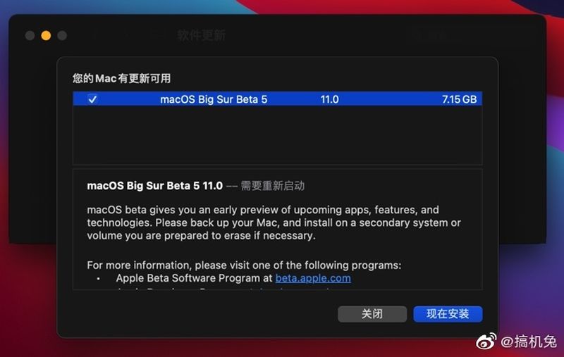 两周前发布第四个 Beta 版更新之后,今天苹果再次推出了第五个测试版更新。开发者可以前往苹果开发者中心下载 macOS Big Sur 测试版,一旦安装了相应的配置文件,可以通过系统偏好设置中的软件更新机制获得后续的测试版更新。