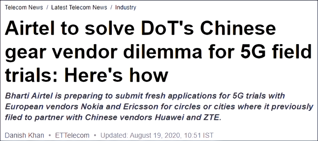 自中印边境冲突后,印度在经济上对中国处处设限,“跟风”英美等国在5G上搞“去中国化”。据《印度时报》旗下的《印度经济时报》(ET)19日报道,该国最大电信运营商巴蒂电信(Bharti Airtel)计划与欧洲5G供应商诺基亚与爱立信合作,在若干城市开展5G试验。而该公司此前在这些城市与中国供应商华为、中兴已经达成合作。