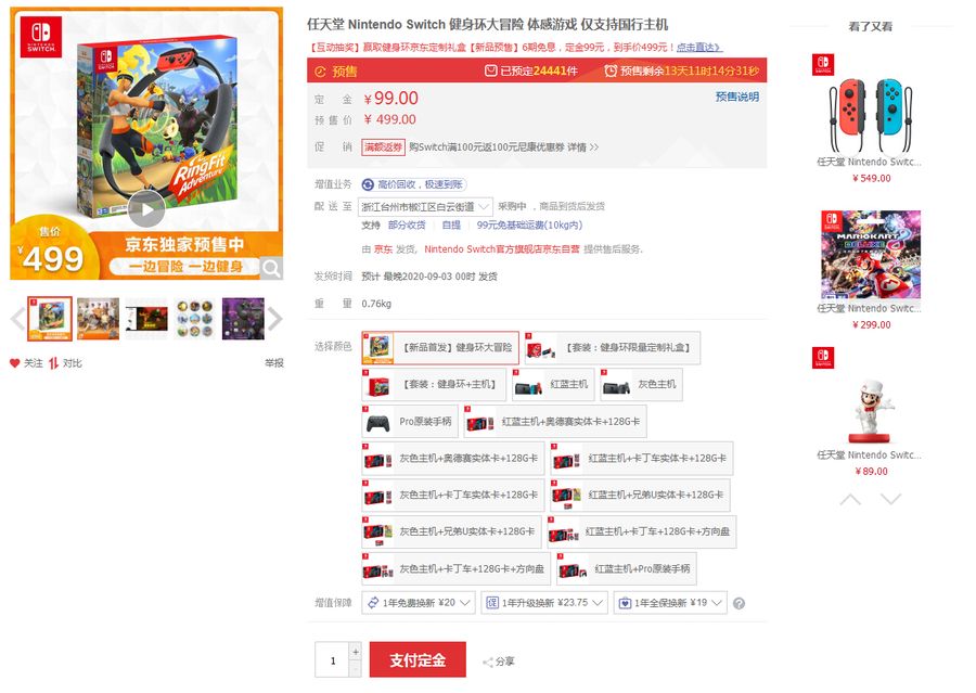 年初引发轰动的在任天堂的Switch主机上,可能没有一款游戏像《健身环大冒险》这样能够引发网络轰动的,年初的时候价格一度炒作到上千元。今天国行《健身环大冒险》正式发售,售价为 499 元,定金为 99 元,支持 6 期免息付款。