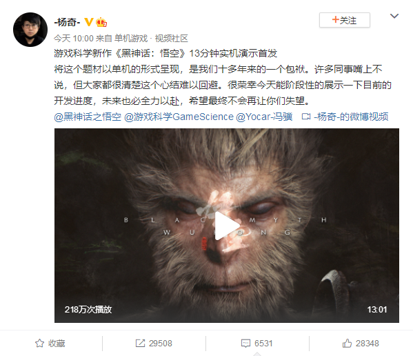 8月20日上午,国产单机游戏新作《黑神话:悟空》公布了13分钟实机演示,战斗打击感惊艳,有网友表示:看起来不像是国产游戏。游戏出品方游戏科学Game Science联合创始人@-杨奇-表示,将这个题材以单机的形式呈现,是我们十多年来的一个包袱.
