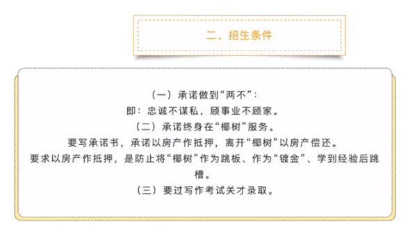 这么丰厚的待遇背后,椰树集团也提出了苛刻的招聘条件,不仅要求能力,关键是应聘者要作出两个承诺: