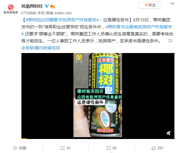 椰树,一个30多年来专注椰汁生产的公司现在又上媒体头条了,这次不是因为椰汁的包装,而是员工招聘规定,公司要求员工抵押房产以便终身为椰树服务。据海南直聘微信公众号8月19日发布的文章,中国饮料十强企业椰树集团有限公司发布招聘信息,“椰树培养职业经理学校”公开招生,承诺总经理有百万年薪、有别墅奖、有分红股奖、有海景房奖。