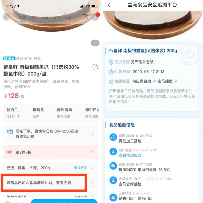 目前,该溯源体系已覆盖盒马所有进口海鲜、国内活鲜(鱼虾蟹贝)、冰鲜、冻海、进口肉禽等商品,对于加入溯源计划的商品,除了对应的批次核酸检测报告,消费者还可以查看到商品对应的批次号、进货日期、商品当时的运输车辆车牌号、车厢内温度、养殖基地、捕捞时间等溯源信息。