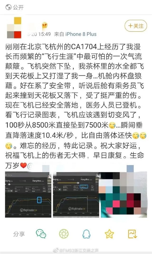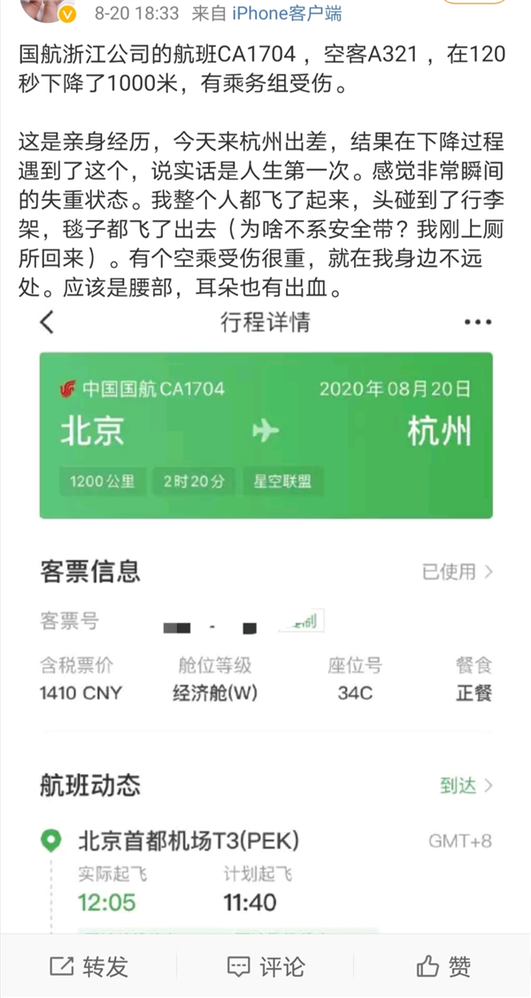 据网友曝料,8月20日下午从北京飞往杭州的国行CA1704航班突发意外,在120秒的时间里高度下降了足足1000米,导致多名乘客和空乘受伤。据一位亲身经历的乘客表示,这是他人生第一次遇到这种情况,当时感觉瞬间失重,而且由于刚从卫生间回来,没来得及系安全带,整个人都飞了起来,头碰到了行李架,毯子也飞了出去。