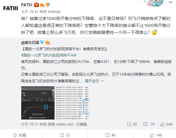 总之,不论是上次的骤降6000米还是这次的急坠1000米,下降速率其实都是正常的,并不是大家想象中的那样短短几秒钟飞机失控直坠,所谓人都飞起来的说话其实是有些乘客故意夸张而已。