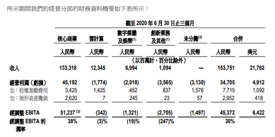 从营收分析,财报显示,阿里第一财季核心商业营收1333.18亿人民币,同比增长34%;云计算业务营收123.45亿人民币,同比增长59%;数字媒体及娱乐收入69,94亿人民币,同比增长9%;创新业务及其他营收10.94亿,同比下降6%。