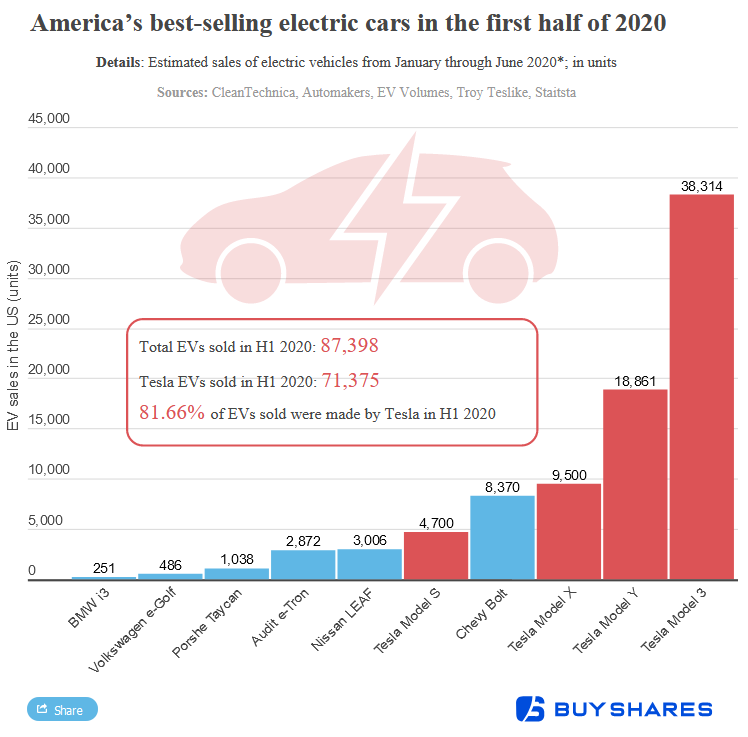 特斯拉在美国可能比你预计的还要受欢迎。事实上,在2020年上半年销售的所有电动汽车中,特斯拉占比超过80%。专注于提供金融知识培训业务的公司Buy Shares的数据显示,今年上半年美国人购买了87398辆电动汽车,其中,71375辆是特斯拉。