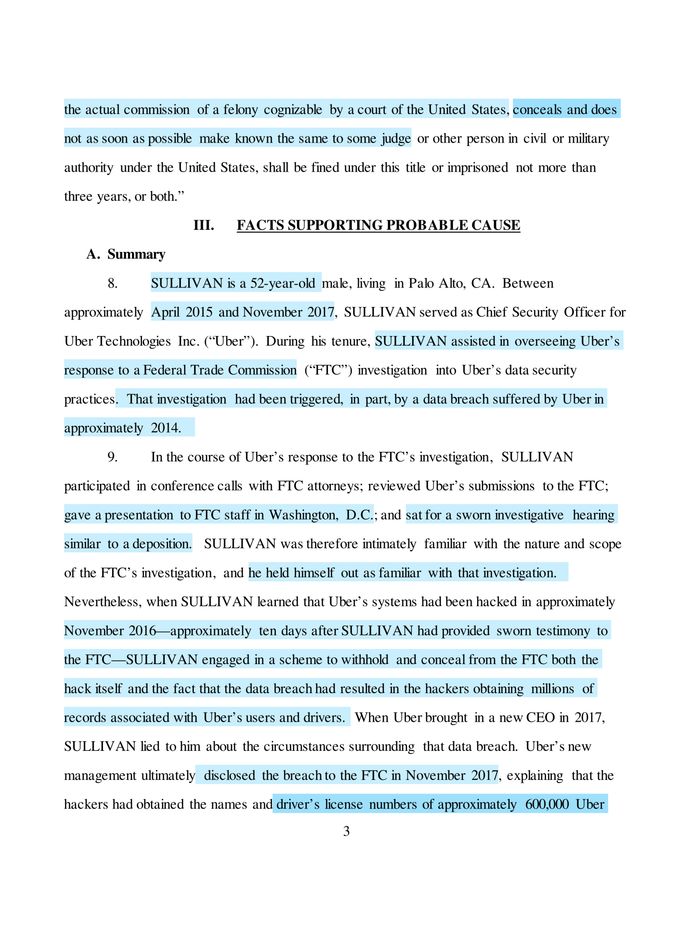 美国司法部指控52岁的沙利文犯有妨碍司法公正的重罪。诉讼称,在黑客攻击发生后,美国联邦贸易委员会(FC)开始监督Uber的信息安全工作,但他采取“蓄意的措施”,妨碍FTC了解相关信息。