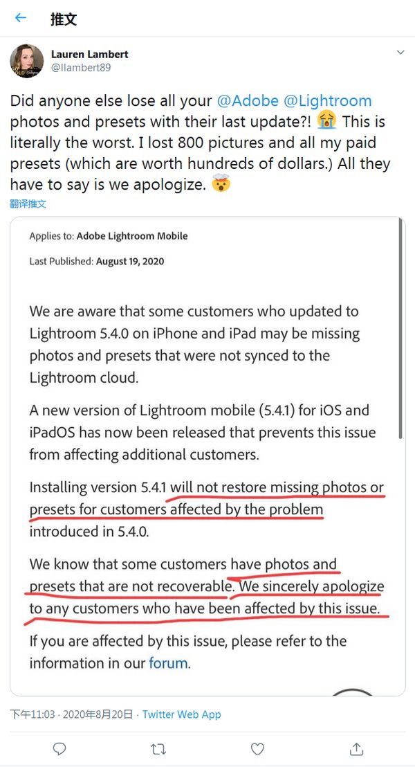 另一位用户在 Twitter 上写道:“这简直太糟糕了。他不仅丢失了 800 多张照片,而且还丢失了价值数百美元的付费预设”。