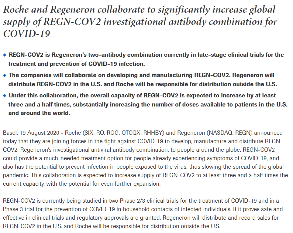 罗氏周三宣布与Regeneron建立新的合作关系。后者目前正在制造REGN-COV2,这是一种既能治疗COVID-19,又能提供临时免疫力的单克隆抗体药物。Regeneron的化合物是两种抗体的混合体,该公司已经与美国政府签订了4.5亿美元的协议。REGN-COV2目前正在进行治疗的2/3期临床试验,以及预防的3期试验。结论还没有出来,但如果该药有效,Regeneron可以在美国分销,而罗氏负责国际分销。
