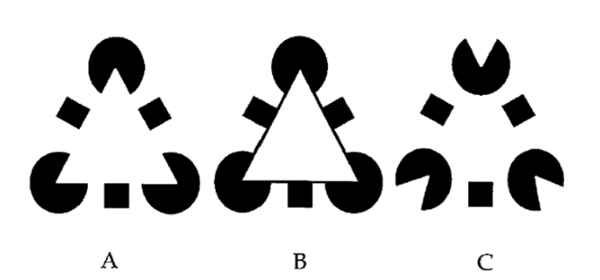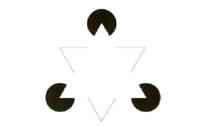 比如,相信大部分人从上面这张图里,除了看见3个缺角的黑色圆形以外,还看见(脑补)了一个白色三角形。这个错觉白色三角被称为 Kanizsa 三角,白三角形轮廓被称作虚幻轮廓,而这类错觉被称为「 轮廓错觉 」 。