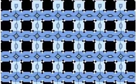 还有下面这张《斯凯蓝色咖啡馆墙上的错觉》。下面这些线条看上去要么向左下倾斜,要么向右下倾斜,但其实它们是水平线,而且彼此平行。只是线条中的钻石图案倾斜度有变化,再加上光线和颜色对比等,每个倾斜成分组合在了一起,导致大家产生了一种,线条整体是倾斜的感觉。