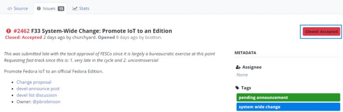 上周举办的 FESCo 会议结束之后,Fedora 工程和指导委员会进行了线上投票,通过了在 Fedora 33 中将 Fedora IoT 升级为"Official Edition"的提案,使其获得与 Fedora Workstation 和 Fedora Server 等相同的认可。