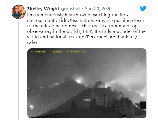 由于COVID-19大流行,天文台的许多工作人员已经在其他地方工作,火灾对标志性地标的威胁比对人类生命的威胁更大。来自加州各地的消防员在该天文台设立了一个指挥所,到周四早上,天文台上的网络摄像机显示所有的穹顶似乎都幸存下来。