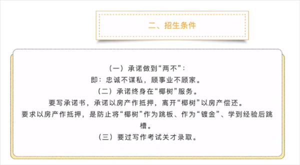 (二)承诺终身在“椰树”服务。要写承诺书,承诺以房产作抵押,离开“椰树”以房产偿还。要求以房产作抵押,是防止将“椰树”作为跳板、作为“镀金”、学到经验后跳槽。