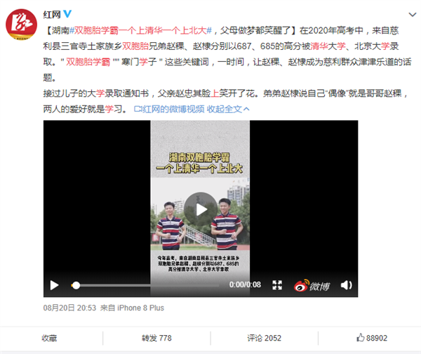 据国内媒体报道,在2020年高考中,来自湖南慈利县三官寺土家族乡双胞胎兄弟赵稞、赵棣分别以687、685的高分被清华大学、北京大学录取。对于双胞胎学霸的事迹,网友们纷纷点赞,还有网友调侃说,清华北大换着上,也不会被发现,真是太爽了。