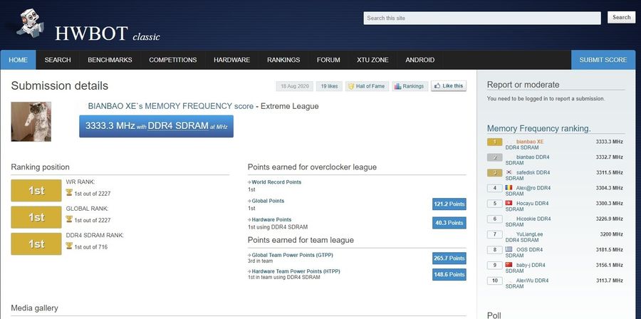为了达成上述记录,本身就是节能版的处理器还进行了调压降频(1889MHz,1.5V),超频后对应的内存时序为30-27-27-58,极少见。