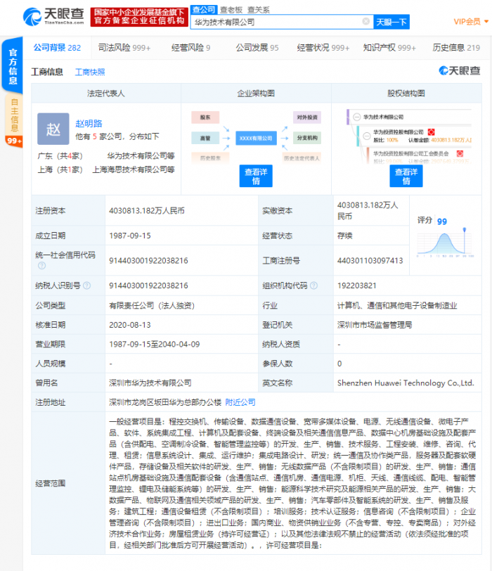 天眼查APP显示,华为技术有限公司成立于1987年9月,注册资本约403亿人民币,法定代表人为赵明路,由华为投资控股有限公司全资持股,目前该公司拥有上万条商标信息。