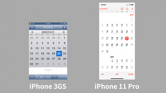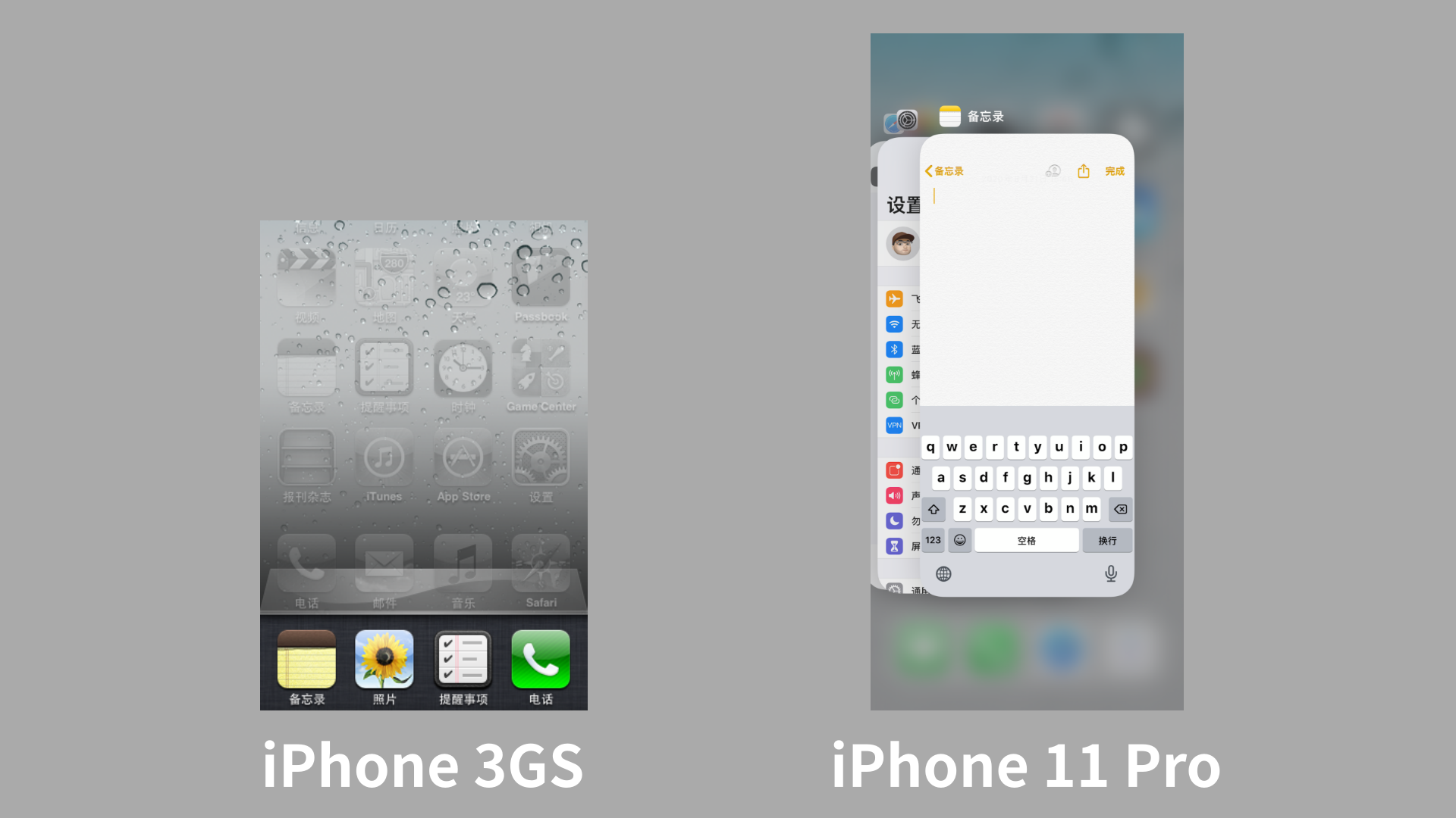 当然 iPhone 3GS 塑料机身的质感,与 iPhone 11 Pro 的玻璃机身 + 不锈钢中框设计相比高下立判,后者虽然更大更沉,而且也不容易单手操作,但整机的质感和十年前相比已然是“质的飞跃”。