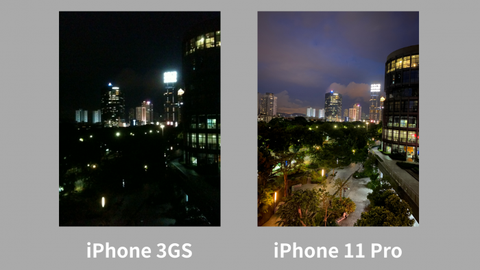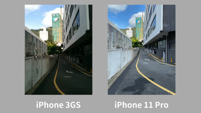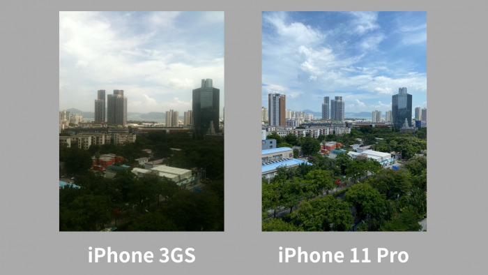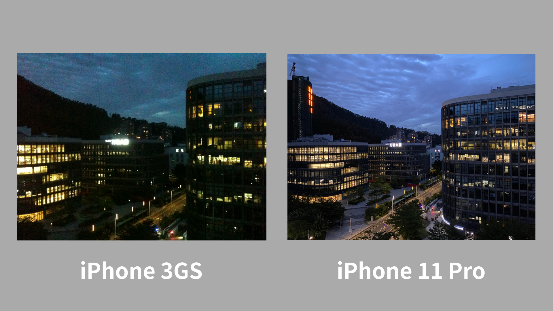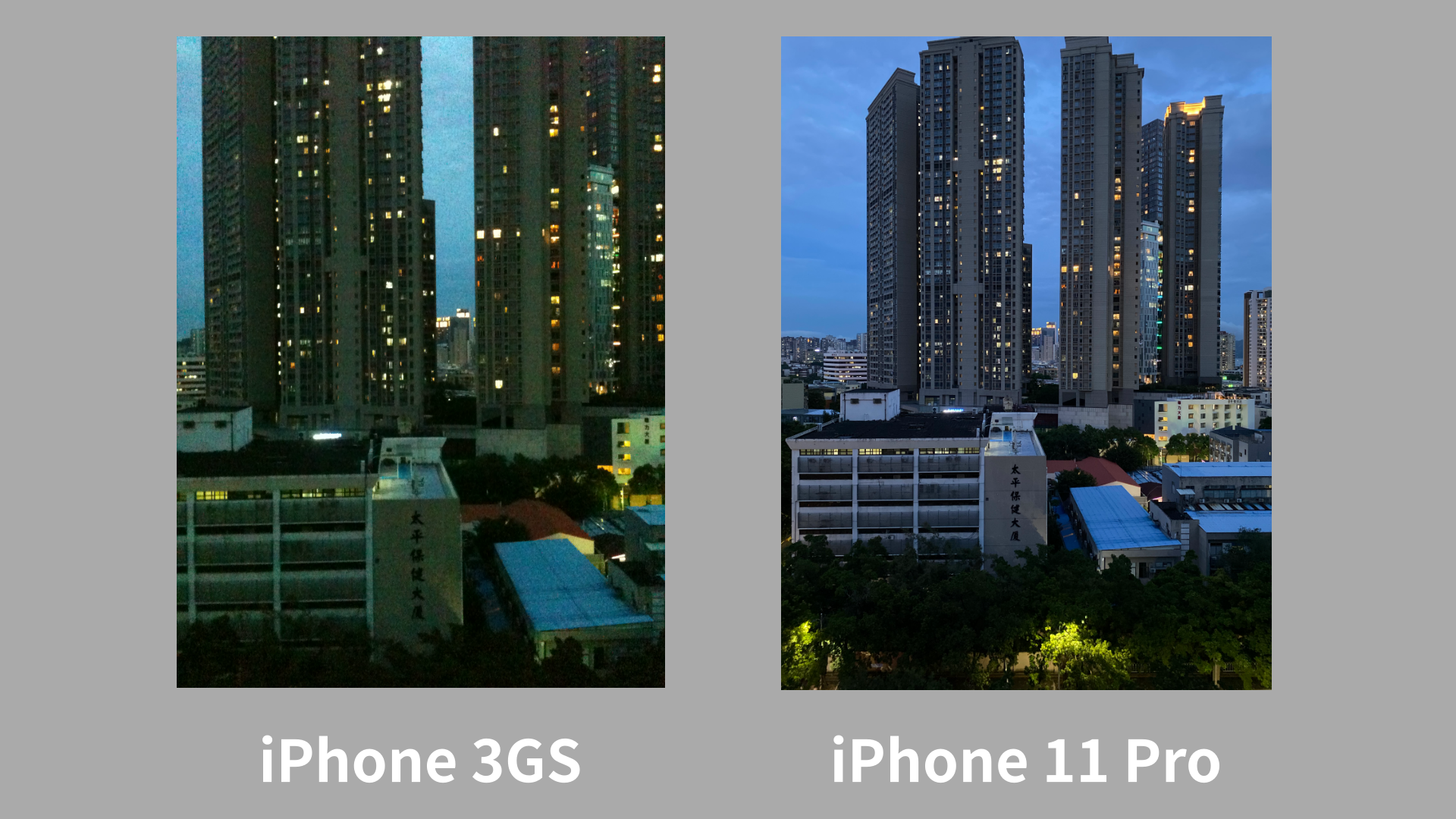 初代 iPhone 2G 和第二代 iPhone 3G 只具备拍摄 120 万像素静态照片的能力,iPhone 3GS 则升级到了 320 万,并且还加入了视频拍摄和自动对焦的功能,但这些配置在去年发布的 iPhone 11 Pro 面前依然“不够打”,直接来看下面的样张对比: