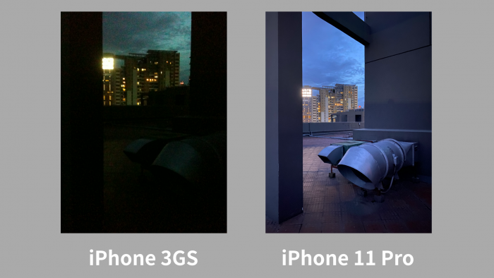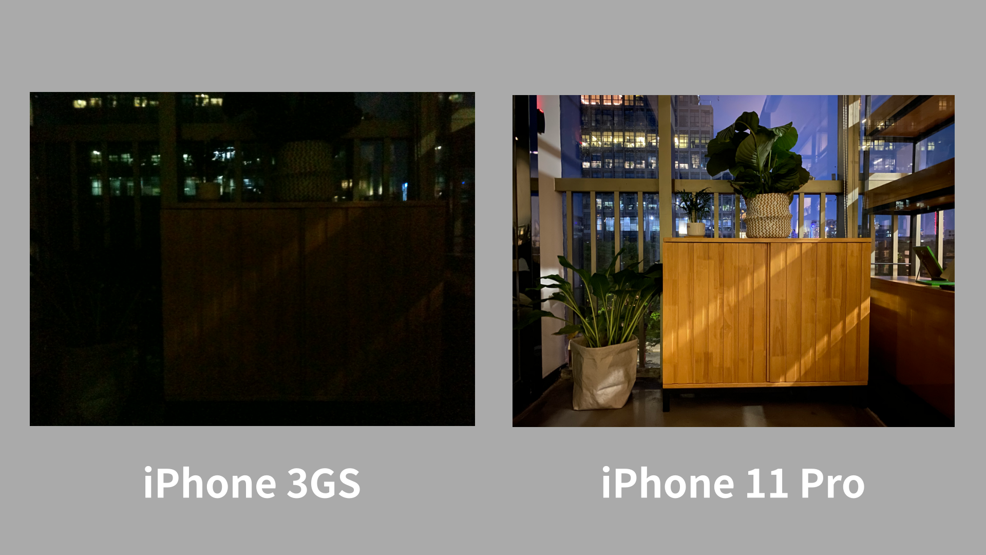 而 iPhone 11 Pro 记录能力的上下限就更高一些,一些 iPhone 3GS 拍出来后满是噪点的场景变得更加纯净,甚至在几乎没有自然光源的场景下,iPhone 11 Pro 依靠“夜间模式”的软件优化也能实现记录,再不济还有一枚后置闪光灯可以充当补光的作用。