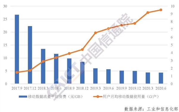 从资费情况来看,截至2020年第二季度末,我国移动数据流量平均资费为4.3元/GB,同比下降了23.25%;用户月均移动数据使用量为9.52GB,同比增长33.8%;移动通信月户均支出为47.8元,同比略降1.3%。