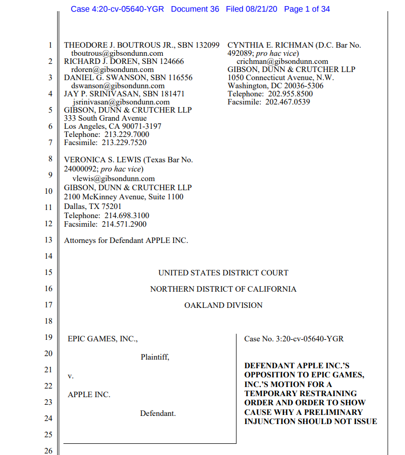 这是苹果公司在两家公司的纠纷蔓延到法院后,对Epic Games的首次重大法律回应。此前一周,Epic Games在《堡垒之夜》 中引入了一种新的付款选项,旨在规避苹果应用程序内购买规则,苹果从中抽取30%的分成。随后,苹果以违反其政策为由,将《堡垒之夜》从其商店中下架。已经在iPhone上安装了《堡垒之夜》的人可以继续玩这款应用,但不能更新或首次下载该应用。