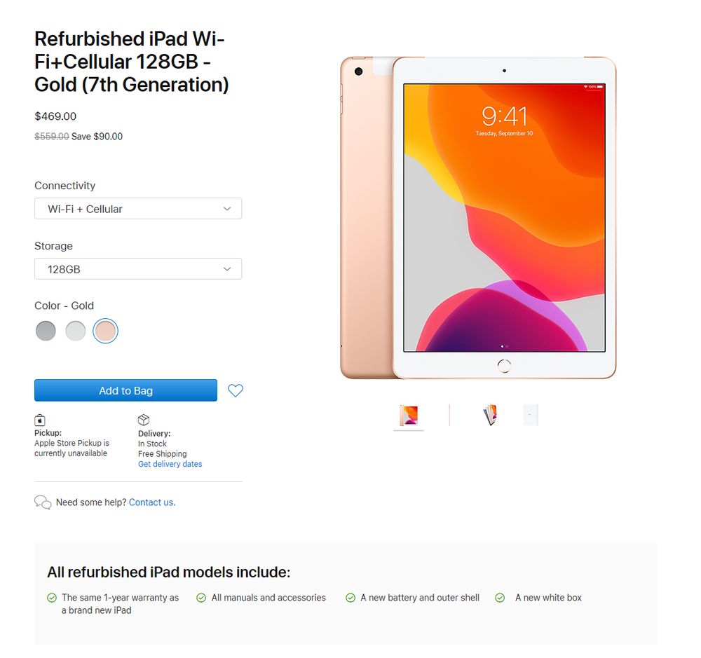 翻新后的 iPad 享有苹果标准的一年保修服务,如果购买 10.2 英寸 iPad 的 AppleCare+,那么保修时间可以额外延长 2 年时间。在美国市场用户可以选择一次性收费 69 美元或者每月 3.49 美元。