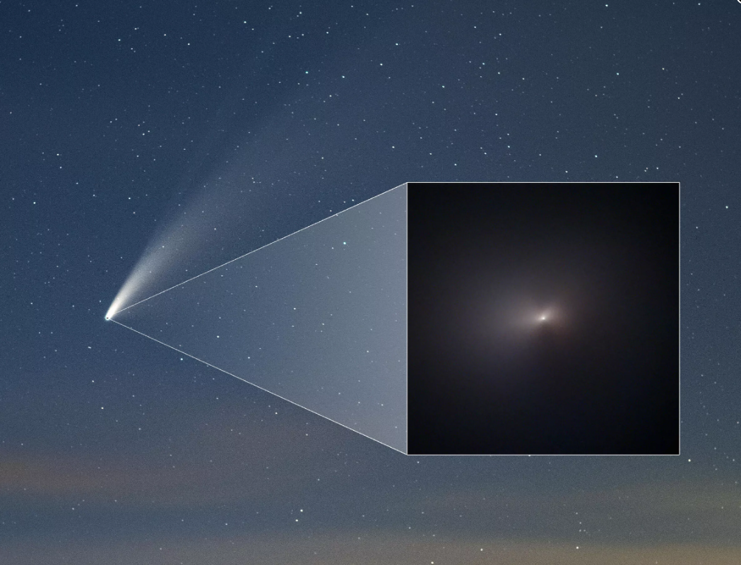哈勃的视图突出了Neowise中心周围的气体和尘埃,这些气体和尘埃形成了双射流。尘埃的颜色可以给科学家提供彗星与太阳热相互作用的线索。“这里的最终目标将是了解尘埃的原始属性,以更多地了解它形成的早期太阳系的状况。”NASA说。