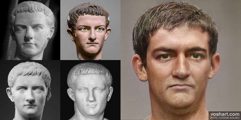 Voshart主要是电影行业的VR专家,因为COVID-19,他的工作项目被搁置了,于是他开始探索自己的一个爱好:给老雕像上色。为了寻找合适的材料进行改造,他开始从罗马皇帝开始着手。他在7月完成了对前54位皇帝的初步描绘,但本周,他发布了更新的肖像和新的海报进行出售。