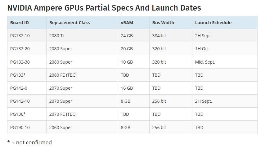 规格方面,RTX 3090预计基于GA102核心,内建5248的CUDA(82组SM),比RTX 2080 Ti多出20%。显存方面直接上到了24GB GDDR6X(384bit、1TB/s带宽),参数华丽,性能指标非常可观。