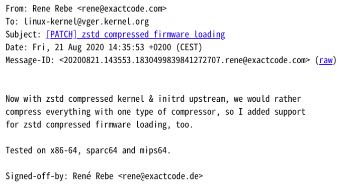 开发者的补丁实现了 zstd 压缩系统固件的支持,逻辑上内核在应用固件前会适当地处理 .zstd 后缀文件。查看 Linux 固件源码 linux-firmware.git,其原始树大小为 593M,粗略估计,使用 Linux 自带 xz 压缩工具,默认不同维度下的压缩级别可将其压缩至 125M 或 204M,zstd 则可将速度大大提升。