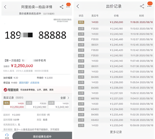 据了解,这个号码的原主人是北京朝阳法院的一起执行案件中的被执行人,这个号码是资产,需要通过变卖变现抵扣欠款。这个手机号的拍卖时间是8月15日10时至8月16日10时。据法院介绍,该手机号码被延时了227次,直至11时18分有用户以225万元的天价成交。